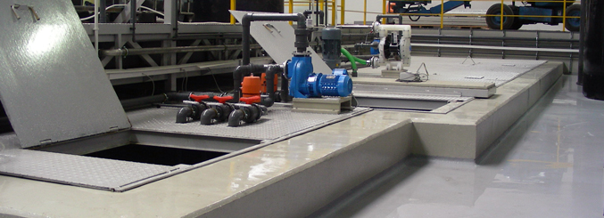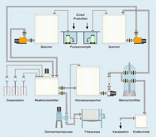 Die bei der Produktion anfallenden Abwässer werden in den Pumpensümpfen gesammelt und in den Speichern vor der Behandlung zwischengespeichert. Ist genügend Abwasser angefallen, wird einer der Speicher in den Reaktionsbehälter umgepumpt und dort mit verschiedenen Chemikalien, wie Salzsäure, Natronlauge und Flockungshilfsmittel, behandelt. Je nach Inhaltstoffen können verschiedene Abwässer gesammelt und mit unterschiedlichen Programmabläufen behandelt werden.