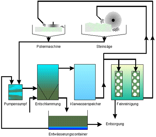 Die im Fertigungsprozeß anfallenden Kühl- und Umlaufwässer werden in einem von der Walter Süßmuth GmbH entwickeltem Kreislaufverfahren von den störenden Verschmutzungen, wie Staub, Steinsplitter, - mehl oder Polierabrieb, gereinigt und das Klarwasser wieder zurückgeführt.