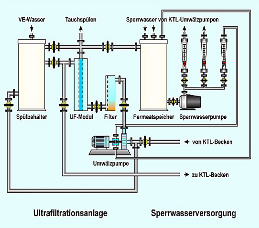 Das Retentat (Lackwasser) zirkuliert über das Ultrafiltrationsmodul in das KTL-Becken der Vorbehandlungsanlage zurück.